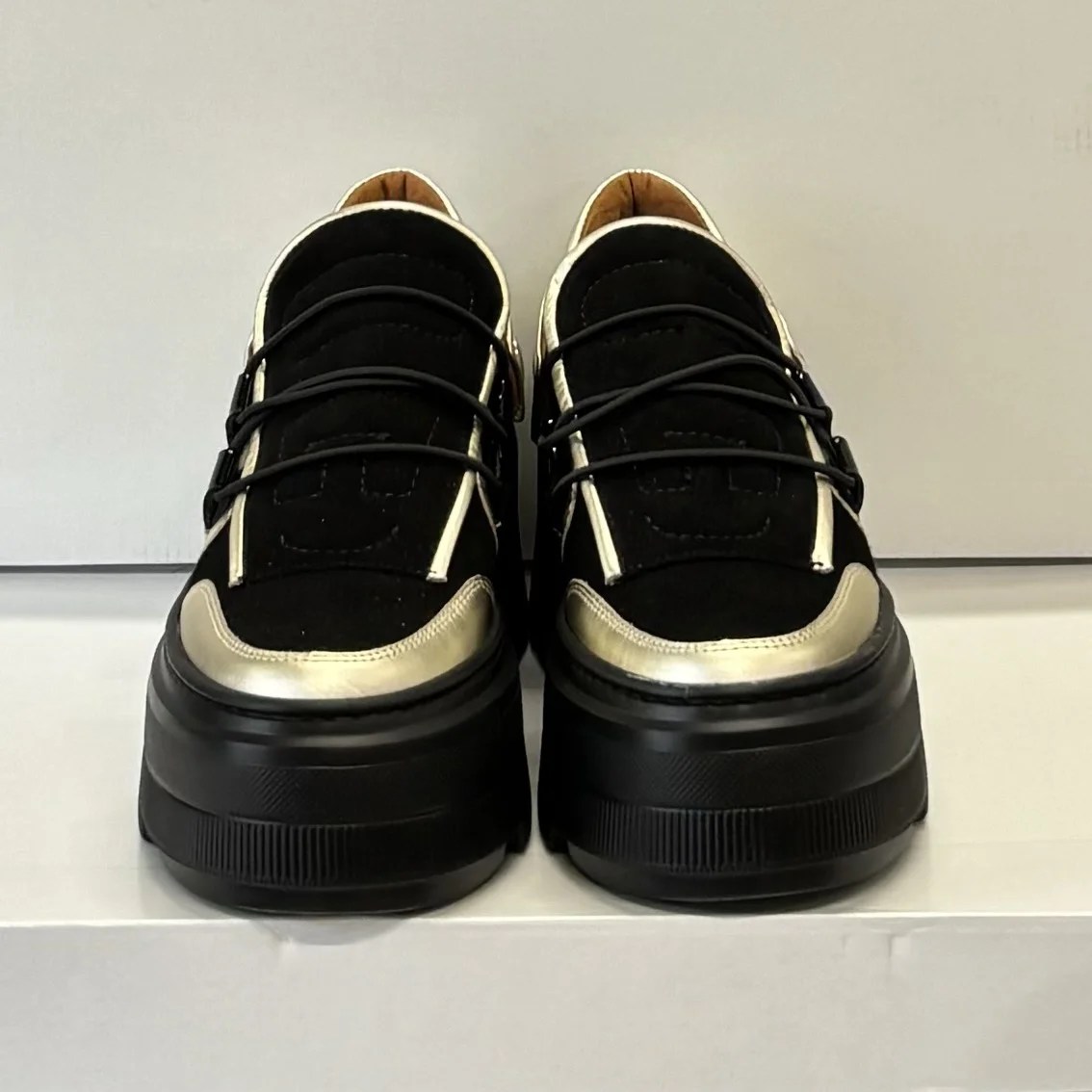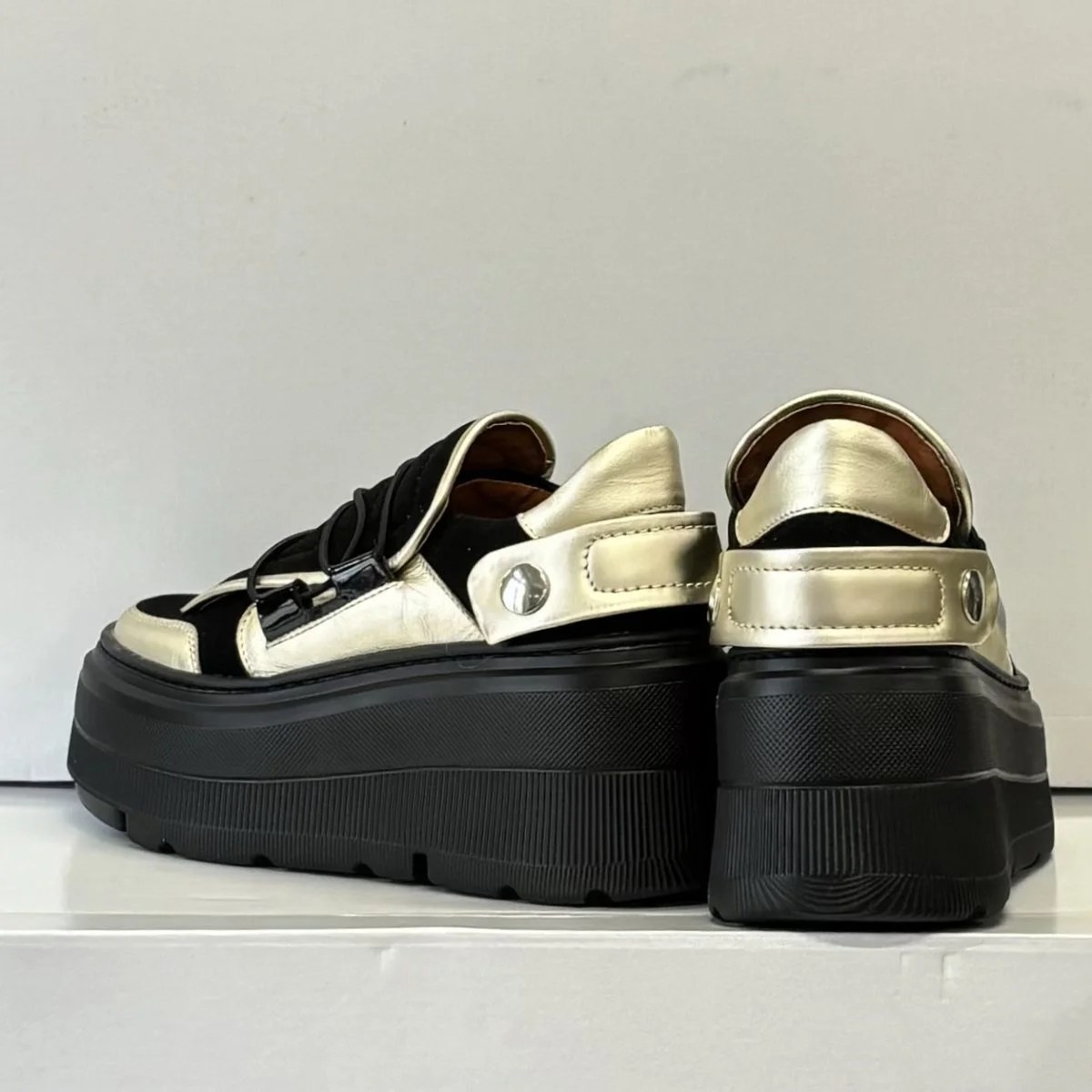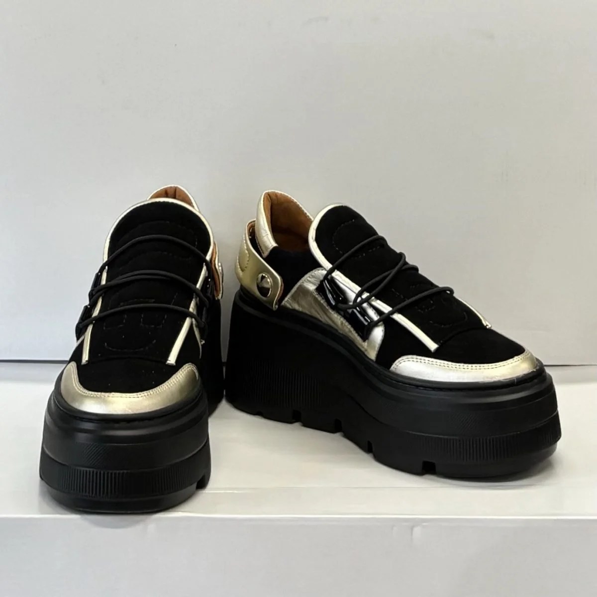 Carla Ricci 507 arany-fekete slipon újdonság a márka ajánlásaiban. Természetes bőr felsőrész. Belseje és talpbélése is bőr. Talpa kiváló minőségű tartós anyag. Talpvastagság elöl 5 cm, saroknál 7 cm.