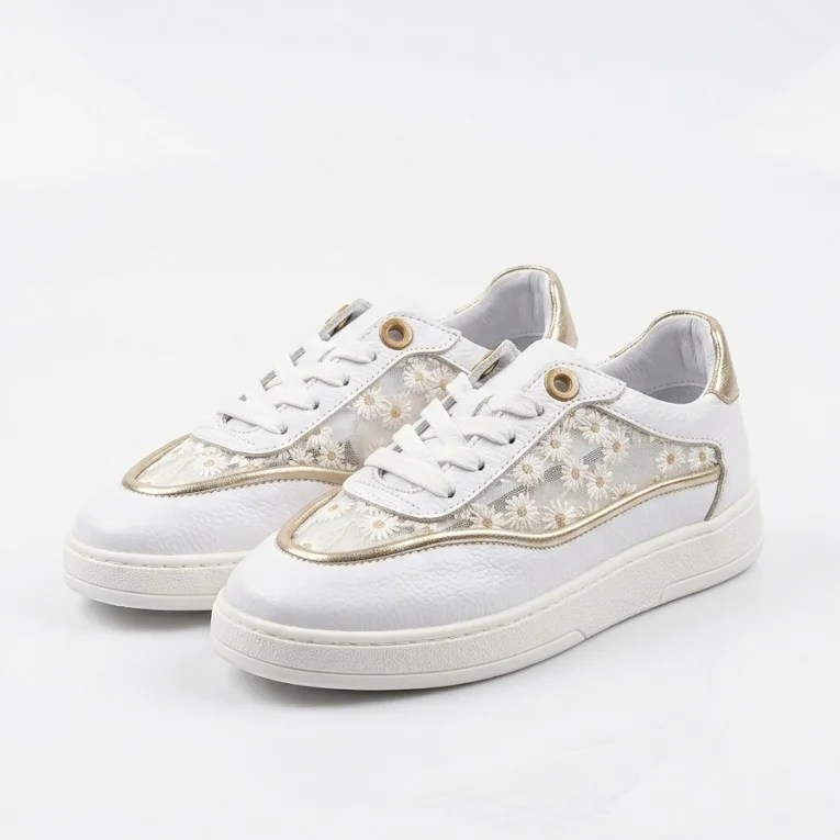 Tutto Bene 136 fehér virágos sneaker újdonság a márka ajánlásaiban. Természetes bőr felsőrész. Belseje és talpbélése is bőr. Talpa kiváló minőségű tartós anyag. Talpvastagság elöl 2 cm, saroknál 3 cm.