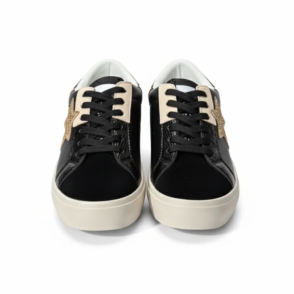 Tutto Bene 521020 fekete-ocelot promóciós sneaker újdonság a márka ajánlásaiban. Textil és szintetikus felsőrész, belső. Talpa kiváló minőségű tartós anyag. Talpvastagság elöl 3 cm, saroknál 3,5 cm.